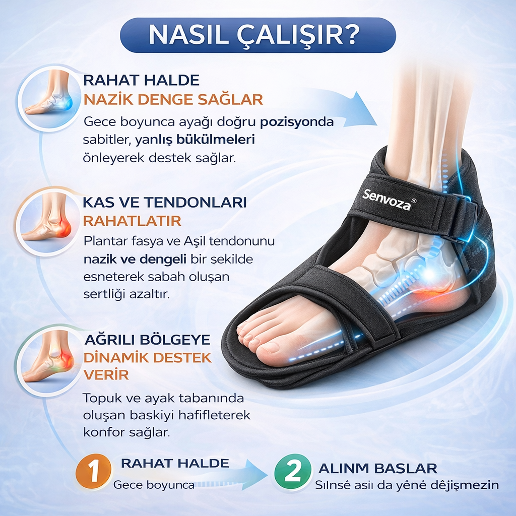 Senvoza™ Gece Destek Ateli, uyku sırasında ayağınızı nazikçe sabit pozisyonda tutarak sabah oluşan sertlik ve gerginliği azaltmaya yardımcı olur. Hafif ve ayarlanabilir yapısı sayesinde gece boyunca konfor sunar, güne daha rahat ve esnek adımlarla başlamanızı destekler.